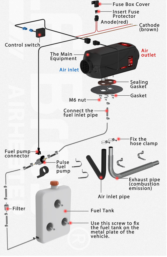 -Dimenzije (enake kot pri WEBASTO Airtop Eberspacher): Višina: 11cm , Dolžina 28cm, Širina 11cm